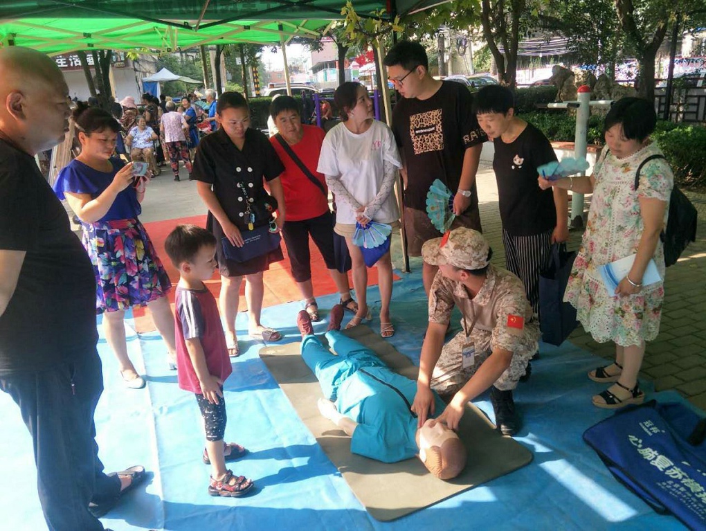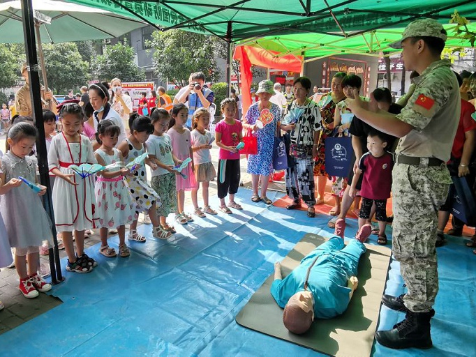 通过现场模拟示范,工作人员详尽地介绍心肺复苏的步骤,幼儿园小朋友们和居民群众现场学习了心肺复苏自救知识,提高了自救、互救能力。